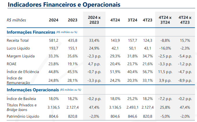 Lucro Líquido: O lucro líquido do 4T24 foi de R$ 42,1 milhões, uma queda de 16,0% em relação ao trimestre anterior e uma leve diminuição de 2,3% em relação ao 4T23. No entanto, no ano de 2024, o lucro líquido atingiu R$ 193,7 milhões, um aumento de 24,9% comparado a 2023.